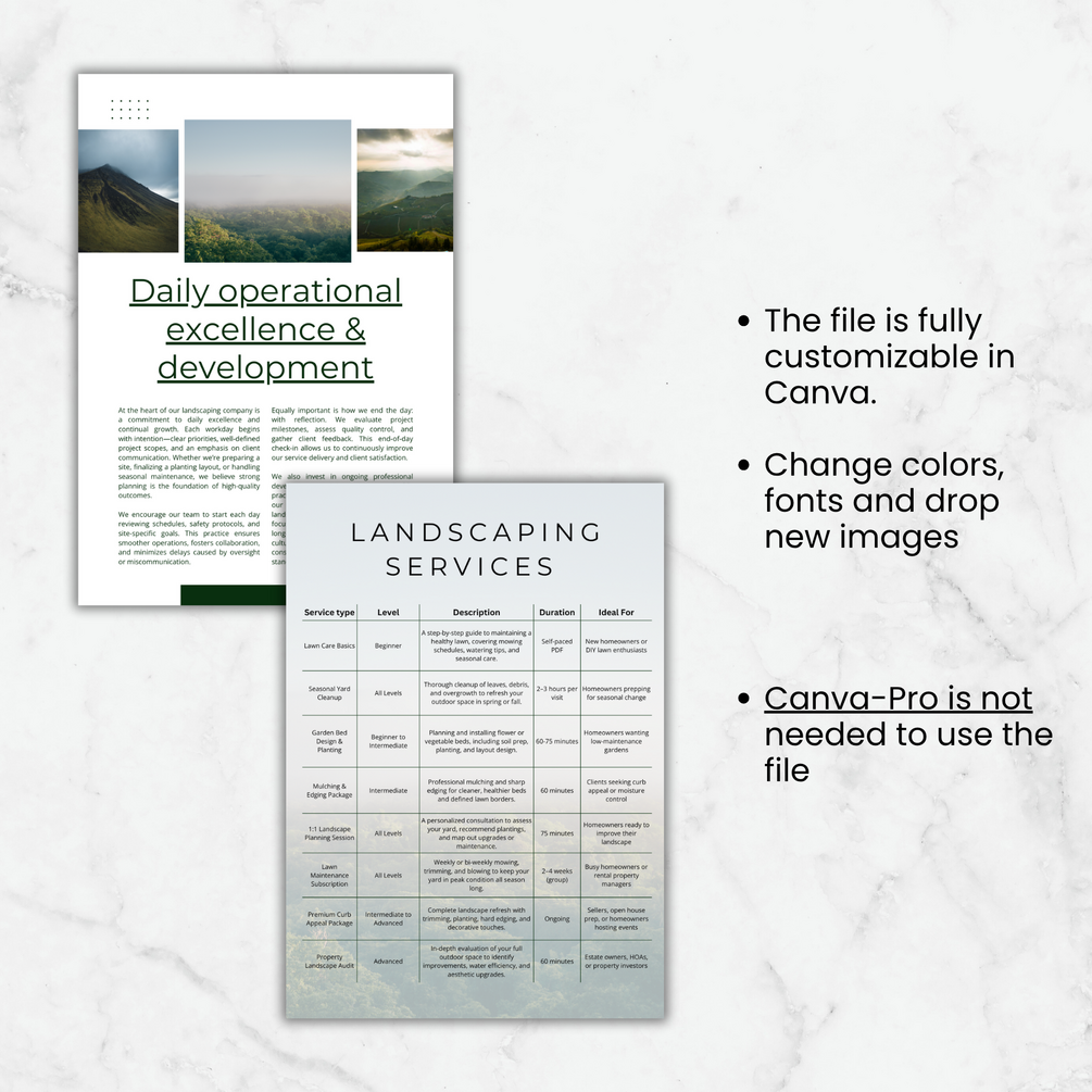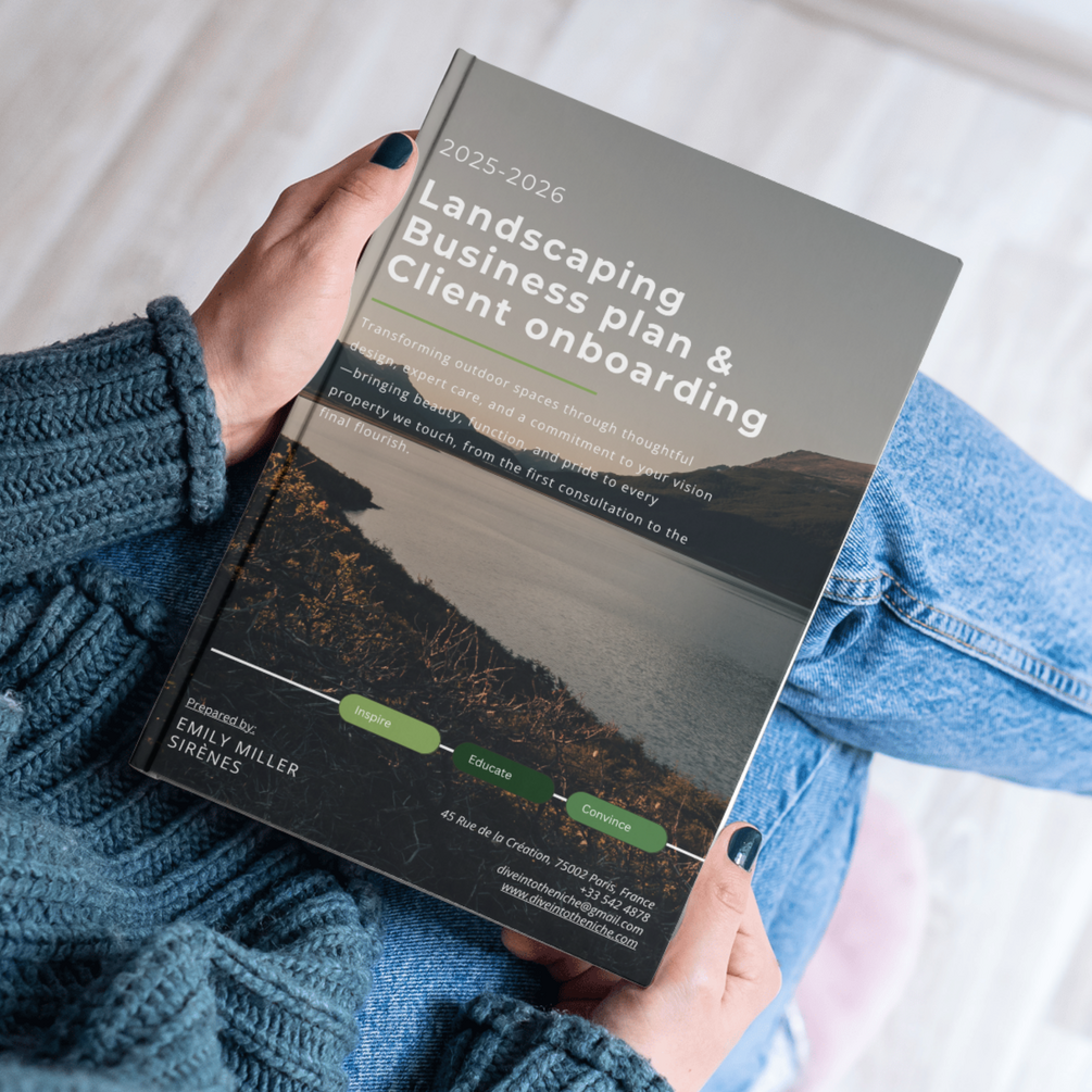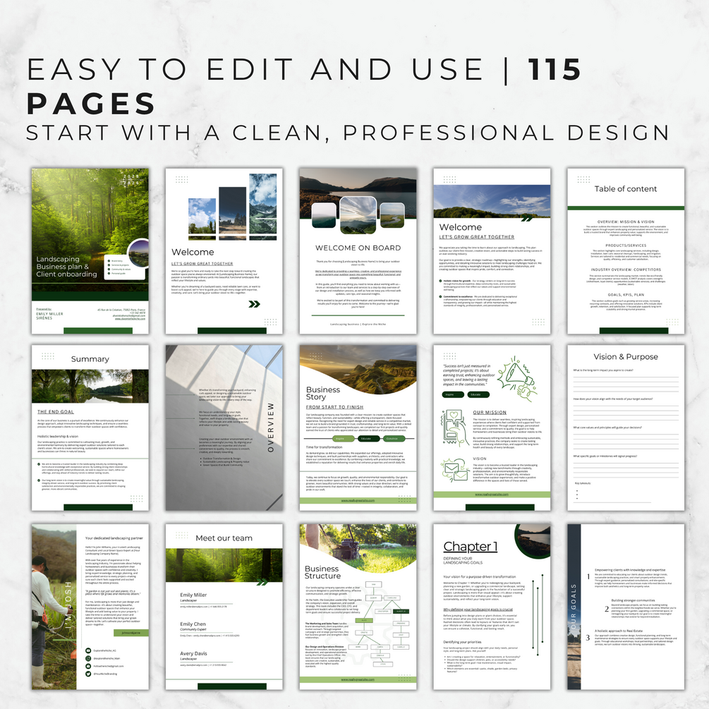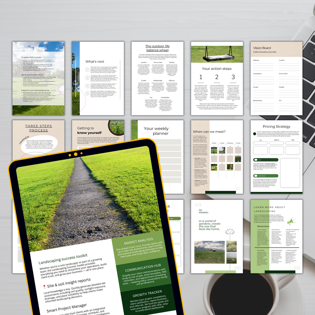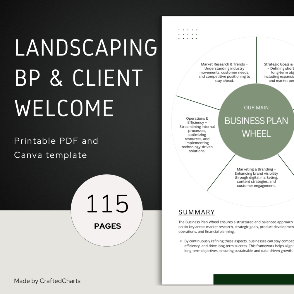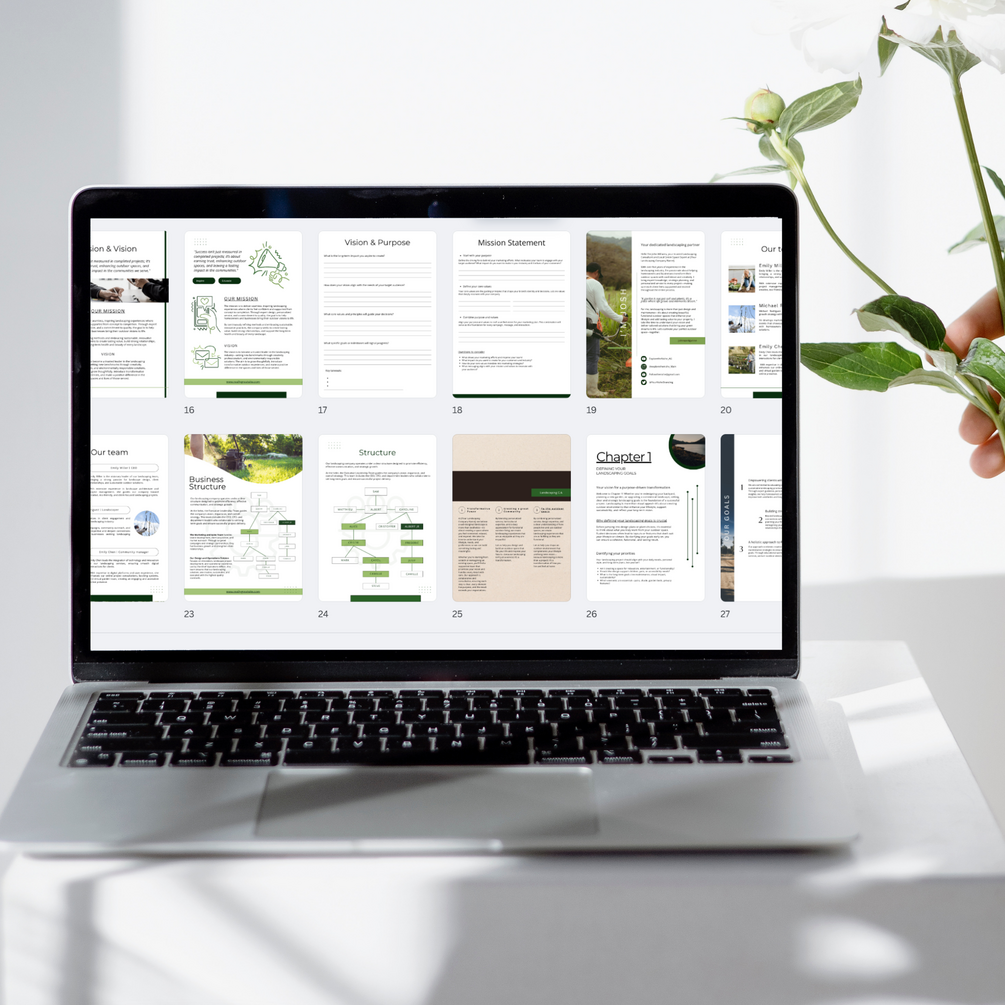 Landscaping Business Plan Template PDF – 115 editable Canva pages to plan services, streamline client intake, and grow your business. Instant download.
